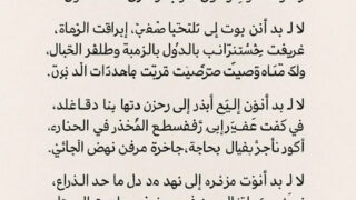 ソース:ジャミ・アル=カーニーン(ジョン・ミスフィールドの作風で)私は村に戻らなければなりません。私は引き裂かれています。笑い声の言葉、そして慰めの糸さえも手に入れなければなりません。バドル・アル=アンクバル、そしてアヌバとタリクの歌声と切...