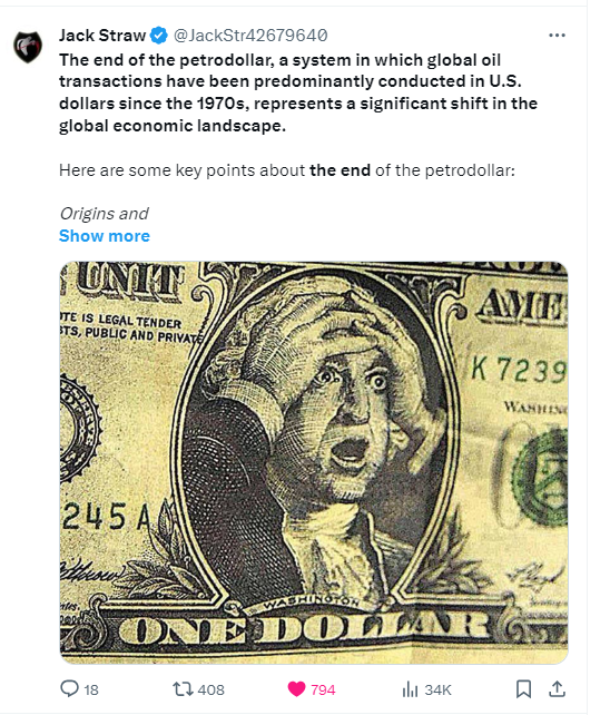 オイルダラーの終焉は、世界経済と地政学の時代の終焉を意味する。この重大な変化は、国際貿易、通貨の安定性、地政学的な力関係に重大な影響を及ぼす。世界がドルから離れていくにつれ、世界経済秩序は劇的で予測不可能な変化を迎えようとしている。
