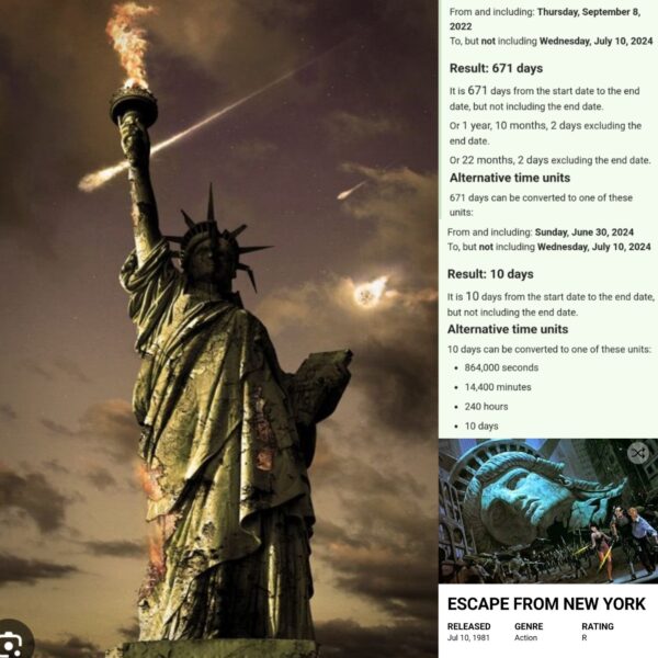 エンパイア・ステートの標識:不吉な前兆。わずか6日前、エンパイア・ステート・ビルは自由の女神像の画像を掲載した。これは、これから起こる出来事を予告する謎めいた合図である。7月10日から10日間の暗闇、つまり内省と激動の時代が始まる。この日は、現在の社会の恐怖と不確実性を不気味に反映したディストピア映画「ニューヨーク1997」の公開記念日でもある。