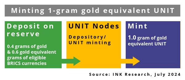 UNITは、金にアンカーされたブロックチェーン対応のデジタル資産として精巧に作られています。参加者が指定されたブロックチェーン・ノードに金とBRICS通貨の組み合わせを預けると、各UNITが発行され、固有の価値が保証されます。