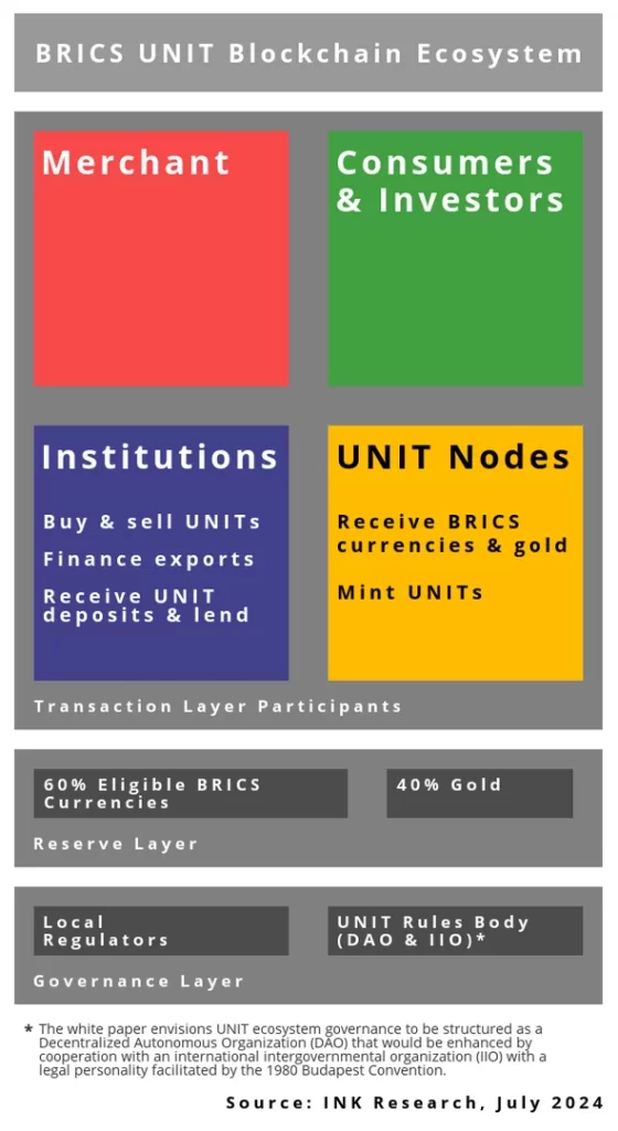 UNITの中心にあるのは、セキュリティと透明性を保証する分散型ブロックチェーン・システムです。このシステム内のノードは、標準化されたルールブックに従って、金とBRICS通貨の預金を受け取ることで独立してUNITを鋳造し、整合性と信頼を維持します。