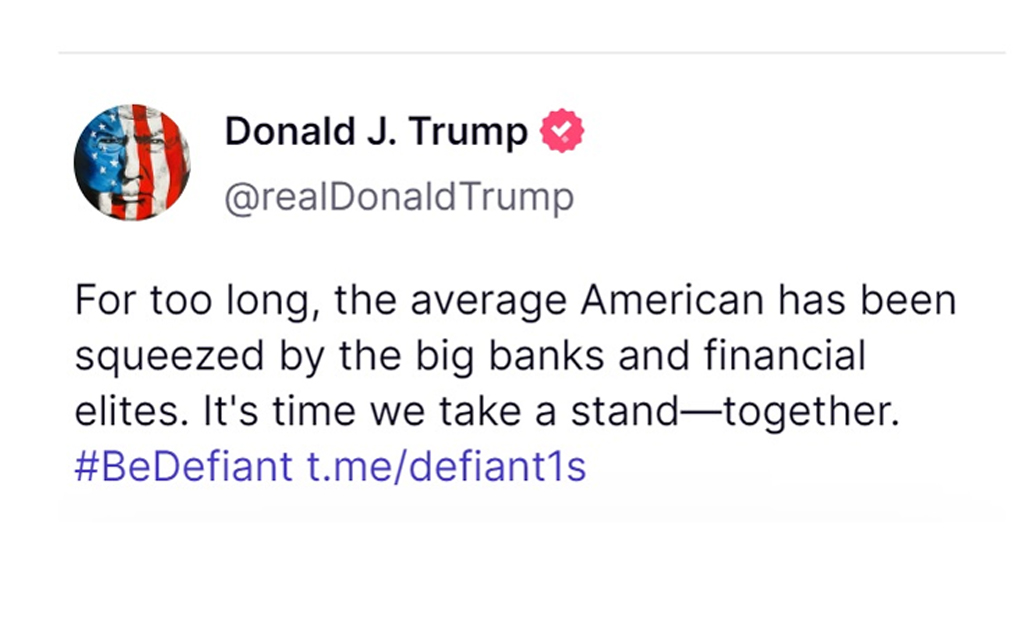 トランプ氏はフォロワーに語りかけ、大手銀行や金融エリートを批判し、米国民に「共に立ち上がれ」と訴えた。