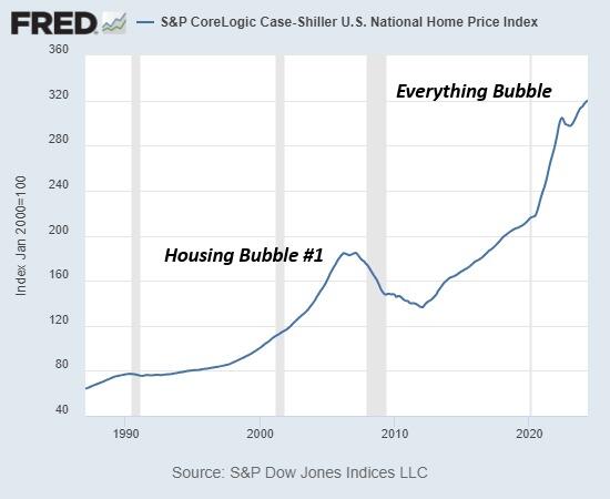 ここで、住宅不動産におけるあらゆるものバブルがいかに極端になり、2006年の住宅バブルの狂気のほぼ2倍になっているかがわかります。ケース・シラー指数は同じ住宅の市場価格を時間の経過とともに追跡するため、統計を操作する方法はないことを思い出してください。
