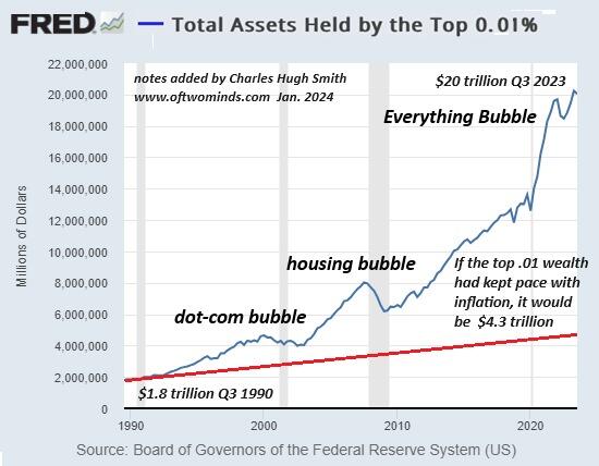 裕福な人々にとって、豊富なのは信用であり、不足しているのは、資産管理ファンド、慈善資本主義財団、およびその他の上位0.1%の前哨地の周りで渦巻く資本の海を吸収するための資産です。この図が示すように、これらの資産は、信用に支えられたすべてのバブルに乗って、前例のない個人資産の高さに達しました。