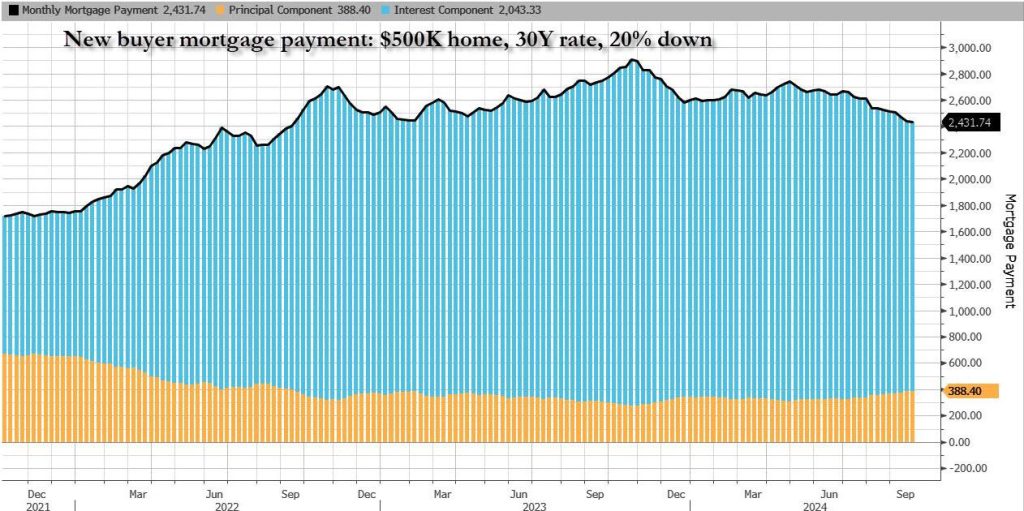 下のグラフは、50万ドルの住宅、30年住宅ローン、20%の頭金の平均住宅ローン支払いの最近の低下を示しています。