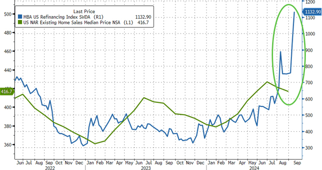 FRBの50bpsの利下げにより、すでに2年間で最も安い住宅ローン借入コストが実現し、住宅ローンの借り換え申請が2週連続で急増しました。住宅ローン銀行協会の借り換え指数(米国のすべての個人向け住宅ローン申請の75%以上をカバーしているデータ)は、9月20日までの週に20.3%上昇し、前週の24.2%の急上昇に続き、2022年4月以来の最高水準に達しました。30年固定住宅ローンの金利は2ベーシスポイント低下して6.13%となり、8週連続の低下となり、2018~2019年以来最長の低下期間となりました。