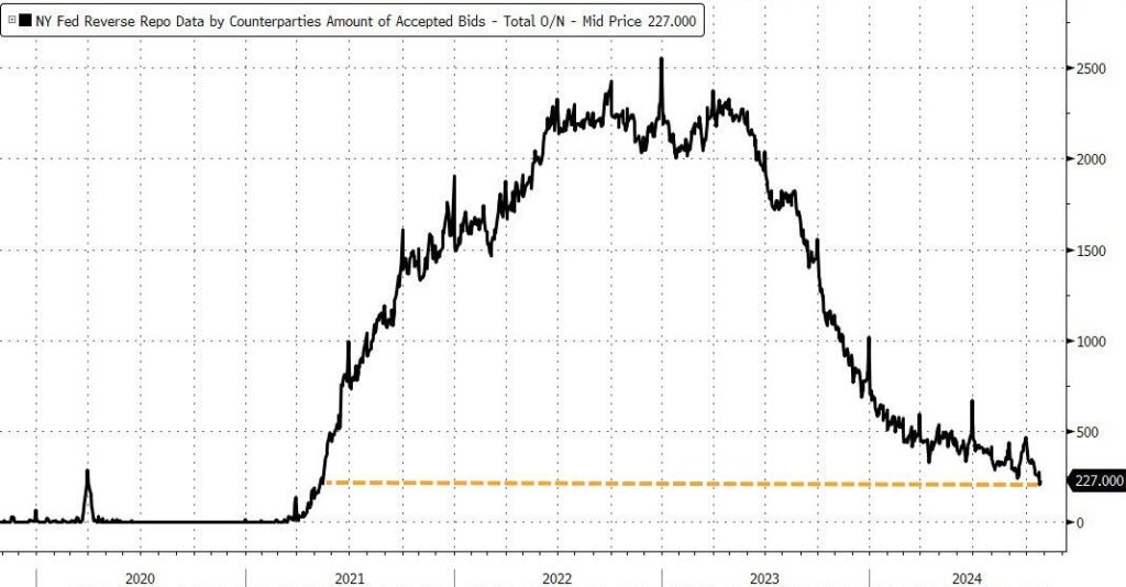 流動性ニーズの観点から、FRBのリバースレポファシリティは、今週も枯渇し続けました(四半期末の急騰以来のサイクル最低まで)…