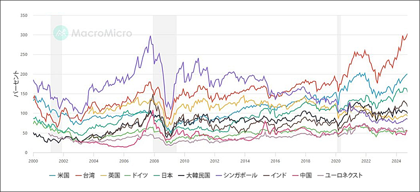 他の主要国はどうでしょうか。ここでいくつか驚きがあります。まず、最も膨らんだバブルは、多くの人が考えているように米国ではなく、台湾です。これは、MicrosoftやNvidiaとともに、半導体とクラウド・コンピューティング部門の間で進行中の大規模な収益の往復スキームの柱の1つであるTSMC(台湾積体電路製造)の愚かな評価によるものです(アーカイブ)。米国は2位で、指標が毎日更新する史上最高値は、現在一般的に無視されています。財政破綻した日本は3位にとどまりました。驚くべきことに、DAX(ドイツ株価指数)と経済が現在完全に相反する2つのトレンドにあるドイツは、バブルがドイツ国内で主に事業を行っているすべての上場企業と比較して比較的限られた割合を占める30の最大の株式にのみ集中しているため、バフェット指標がそれほど高くありません。当然のことながら、中国は国内のバブルがはじけたことを示す兆候として最下位になりました(そして、前に議論したように、政府はそれを再び膨らませるつもりはありません)。