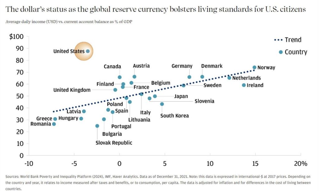 貿易と国際金融システムにおける米ドルへの依存は、米ドルと国債に対する世界的な需要を人為的に高めます。