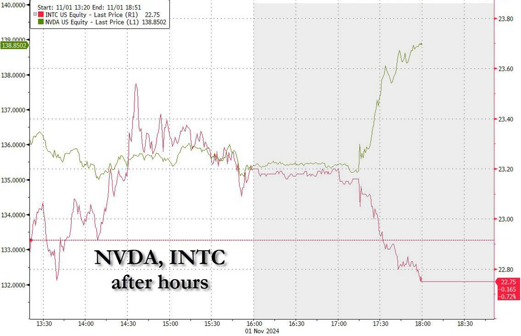 Nvidiaの最近の記録的な上昇が勢いを失っているかに見えたちょうどその時、金曜日遅くに突然の出来事が起こりました。ダウ工業株30種平均を所有するS&Pダウ・ジョーンズ・インデックスの決定委員会が、ダウ工業株30種平均(明らかに全くそうなってはいない)でIntelに代わってNvidiaが採用されると発表したのです。これは優良株指数の大変動であり、低迷する半導体企業に代わってAI用GPUの主要ベンダーが採用されることになります。これとは別に、皮肉にもSherwin-Williamsがかつての化学大手(そしてダウ・ジョーンズの代名詞)だったダウも平均採用銘柄から外すことになります。この切り替えは11月8日に行われます。