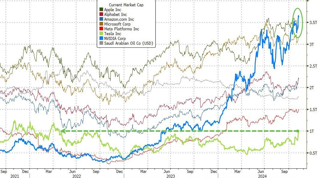 TSLAは今週、時価総額が1兆ドルを再び上回り、NVDAは新たな記録領域に向けて前進を続け、現在ではAAPLを大幅に上回っています…