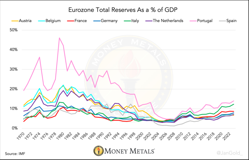 ユーロ圏内の総準備金対GDP比率を時系列で視覚的に表すと、これらの国々の準備金管理の連携は驚くべきものです。