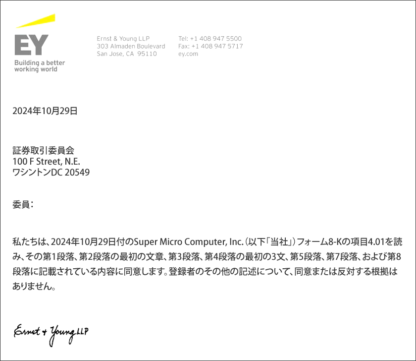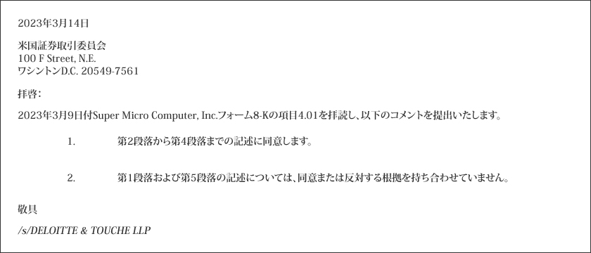 面白いのは、Deloitteは2003年からSMCIの監査人を務めていましたが、当時の提出書類に明記されているように、収益認識会計に関してSMCI経営陣と意見が合わなかったため2018年に辞任したということです。