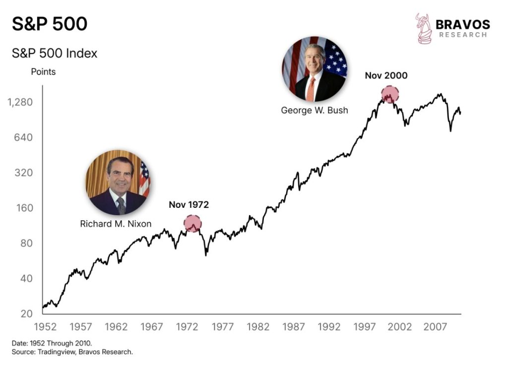 7/ 同様に、1972年のニクソンと2000年のブッシュはどちらも減税と自由市場経済を推進しました。