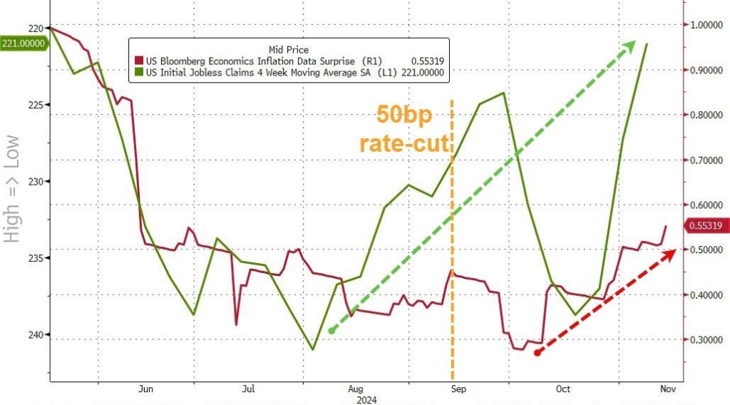 最後に、このグラフは、失業保険申請件数(逆相関)が6か月ぶりの低水準に落ち込み、インフレ予想外のデータが急上昇していることを示していますが、これは何らかの利下げサイクルを裏付けているのでしょうか?