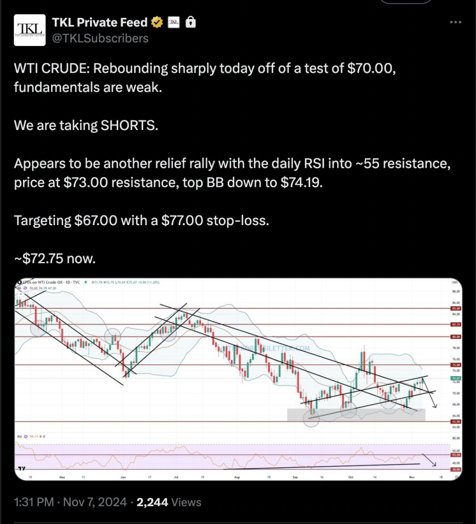 11月7日、プレミアム・メンバーは原油価格の短期的なチャンスについて警告を受けました。ファンダメンタルズは悪化しており、需要予測は下方修正されました。この取引で+8%の利益を得ました。これらの警告にアクセスするには、以下のリンクから登録してください。 http://thekobeissiletter.com/subscribe