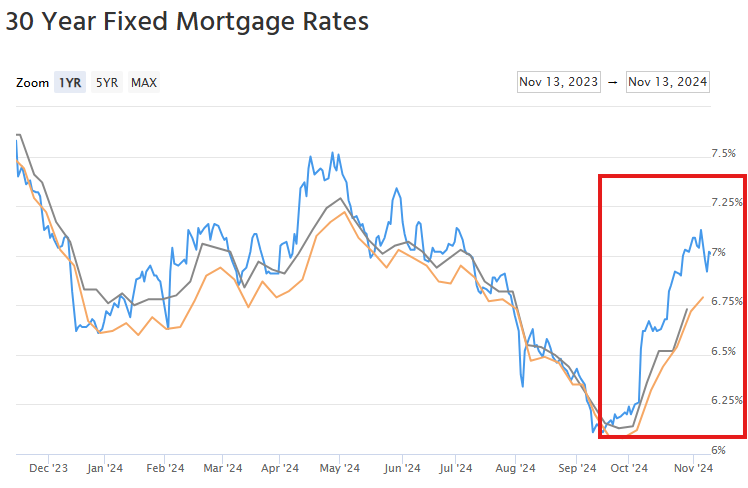 最後に、住宅ローン金利はこの傾向をはるかに上回っています。FRBが9月に50ベーシスポイント、今月25ベーシスポイントの利下げを行ったにもかかわらず、金利は急騰しています。住宅ローン金利は再び7%を超え、次は8%以上になる可能性もあります。