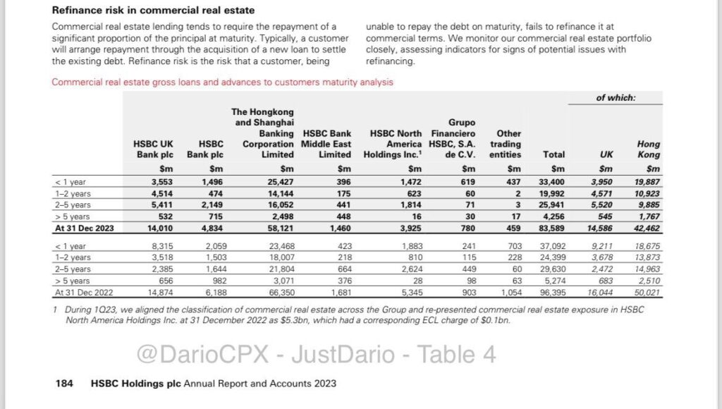 HSBCの報告によると、HSBCのCREエクスポージャーは2022年の964億ドルから2023年には836億ドルに減少しました。HSBCがエクスポージャーのリスクを軽減したのは素晴らしい👏🏻…ことですが、うーん… そんなに急がなくてもいいでしょう。以下に示すように、減少は主に香港での74億ドルのローン返済によるものです。銀行のエクスポージャー削減の取り組みはどうですか? 彼らの答えは、「減少には、ポートフォリオのエクスポージャーを削減する取り組みの一環として、米国での5億ドルのローン売却が含まれています」でした。それだけですか?😳
