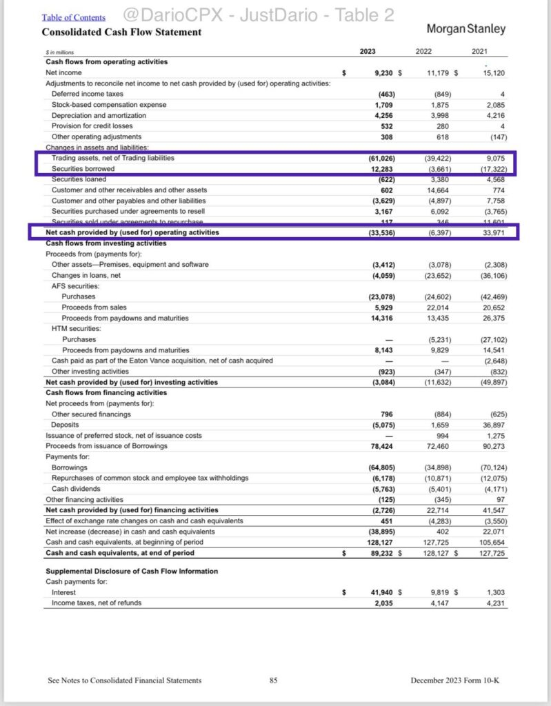 では、ここで何が起こっているのか手がかりを見つけるために、Morgan Stanleyのキャッシュ・フロー計算書を見てみましょう。