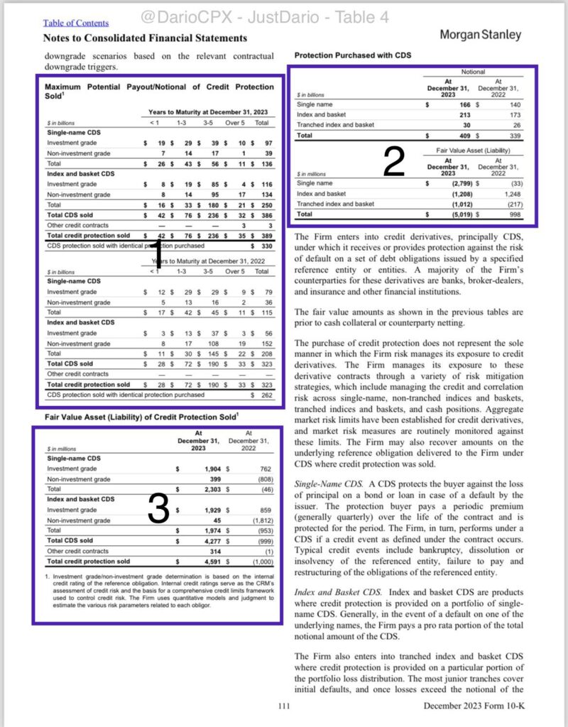 🚩悪名高いJPMorgan Chaseの「ロンドン・ホエール」(JPMorgan ChaseのCIO(最高情報責任者)ブックによると、他のCDS(クレジット・デフォルト・スワップ)が不良化したことによる現金損失をカバーするためにCDSをさらに売却した)のように、2023年初頭の銀行危機と年間を通じてリスクが止まることなく悪化したにもかかわらず、Morgan Stanleyは年間を通じてCDSを660億ドル多く売却しました😳