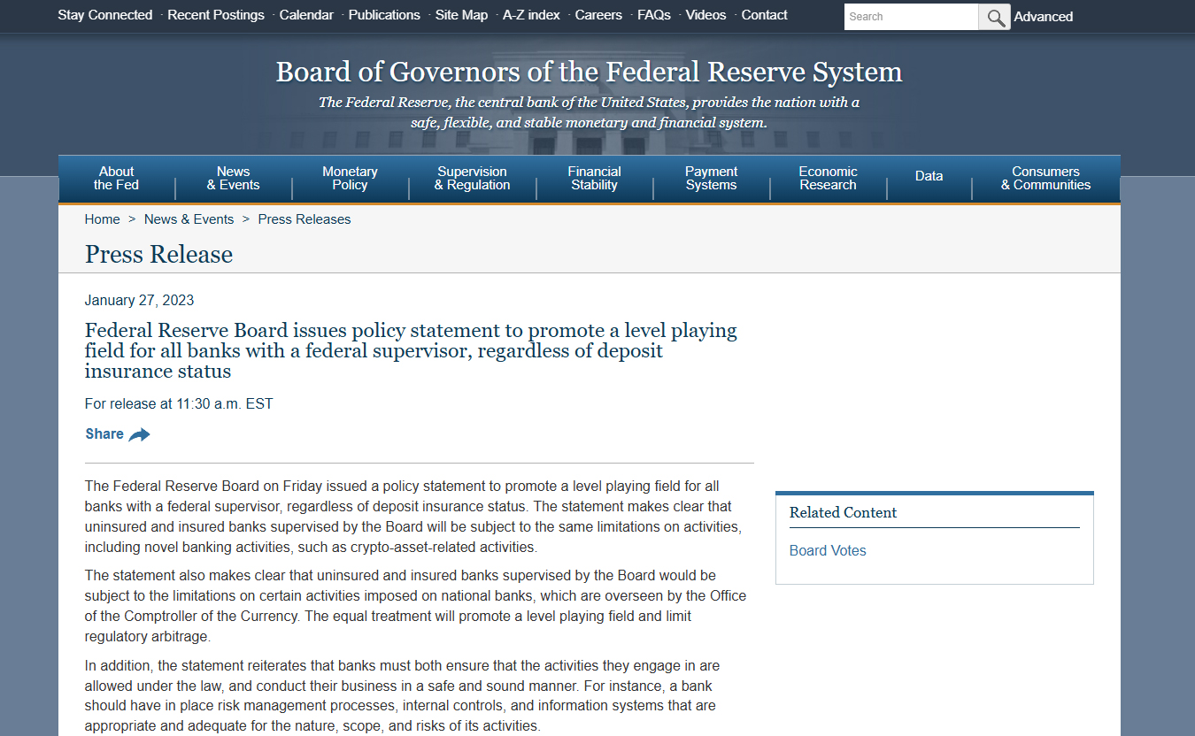 連邦準備制度理事会は金曜日、預金保険のステータスに関係なく、連邦監督機関を持つすべての銀行に公平な競争条件を促進するための政策声明を発表しました。声明では、理事会によって監督される無保険銀行と保険付き銀行は、暗号資産関連の活動などの新しい銀行活動を含む活動に対して同じ制限を受けることが明確にされています。