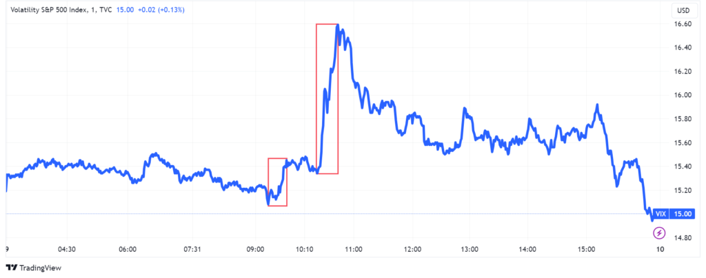東部標準時午前10時22分に一体何が起こったのでしょうか? 何かが突然起こりました。それはVIX(k票不指数)チャートで疑いの余地なく確認できます。ただし、ご覧のとおり、米国株の現金取引の開始直後に発生した小さな突然の現象を強調しています。