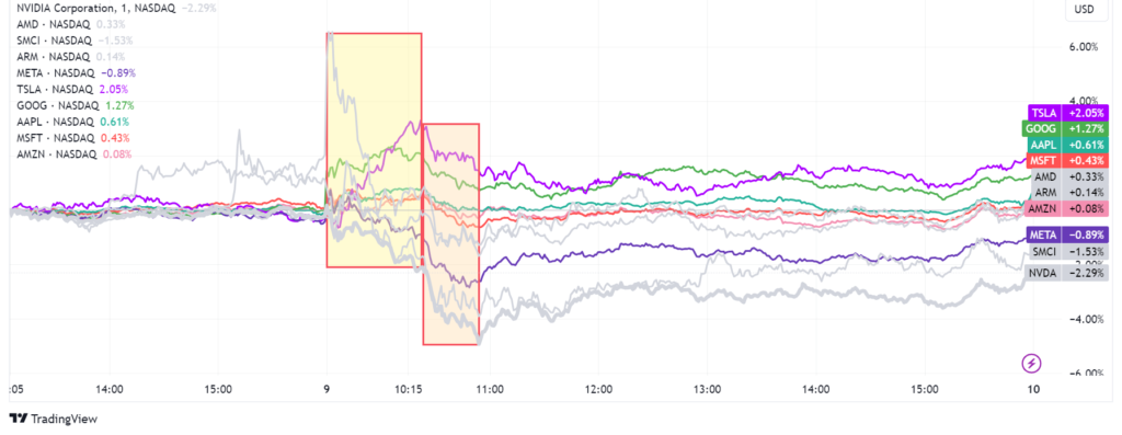 オプション・トレーダーの間で信じられないほどの人気を博している(全員がガンマ・スクイーズへの情熱を共有している)特定の半導体株に焦点を移すと、市場で突然の動きを引き起こした可能性のある手がかりを特定し始めることができます。下のチャートからわかるように、Arm、Advanced Micro Devices(AMD)、Nvidia、Supermicroなどの銘柄は、現金取引セッションの開始直後から、特にプット・オプション(上記の最初のチャートで強調したVIXの最初のスナップに表示)を介して売り注文を受け始めました。その後、東部標準時10時22分に非常に興味深いことが起こりました。これら4つの銘柄の売りが加速する一方で(スナップはしませんでしたが)、VIXが急上昇したのです。