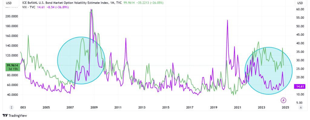 予想通り、MOVE指数(米国債のボラティリティ)とVIXは互いに離れたままであり、これは投資家の間で真の「強気相場」にあるかどうかについて意見が一致していないことのもう一つの兆候です。過去にこのような持続的な混乱を経験したことがあるでしょうか? それは、世界金融危機の直前です。