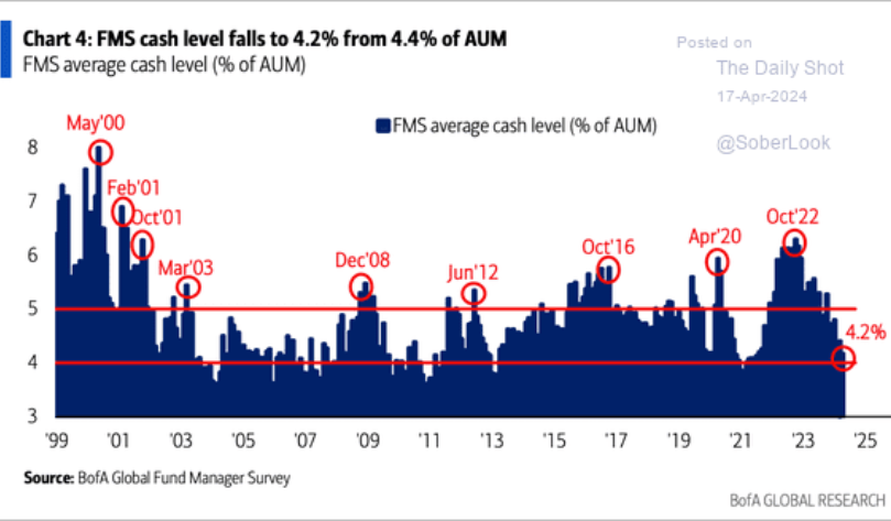 現在、彼の株式ポートフォリオ全体の価値は3,360億ドルで、現金残高は1,890億ドルです。つまり、彼の現金および現金同等物は36%を占めていることになります。現在、市場の幅広い投資家コミュニティの現金配分はいくらでしょうか? 4.2%。これだけでも、ウォーレン・バフェットがこの市場全体についてどう考えているか(そして、ここ数年のQE狂乱に対する彼の見解)について多くのことが分かります。