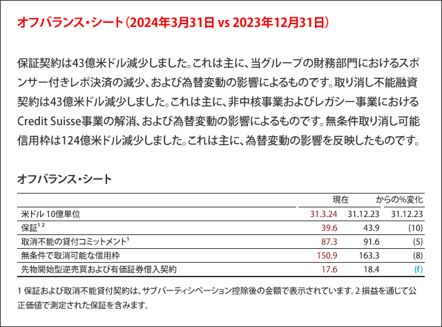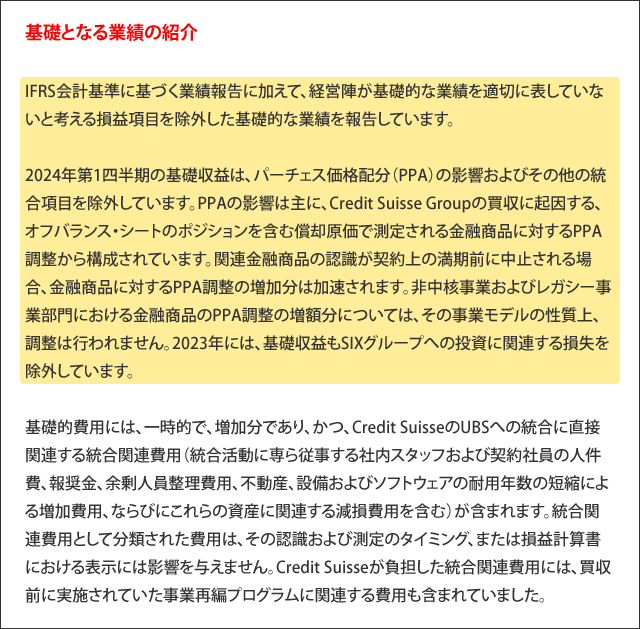 2024年第1四半期の基礎収益には、購入価格配分(PPA)の影響やその他の統合項目が除外されます。PPAの影響は主に、Credit Suisse Groupの買収から生じた、オフバランス・シートのポジションを含む償却原価で測定される金融商品のPPA調整で構成されます。[…] 2023年には、基礎収益にはSIXグループへの投資に関連する損失も除外されます。