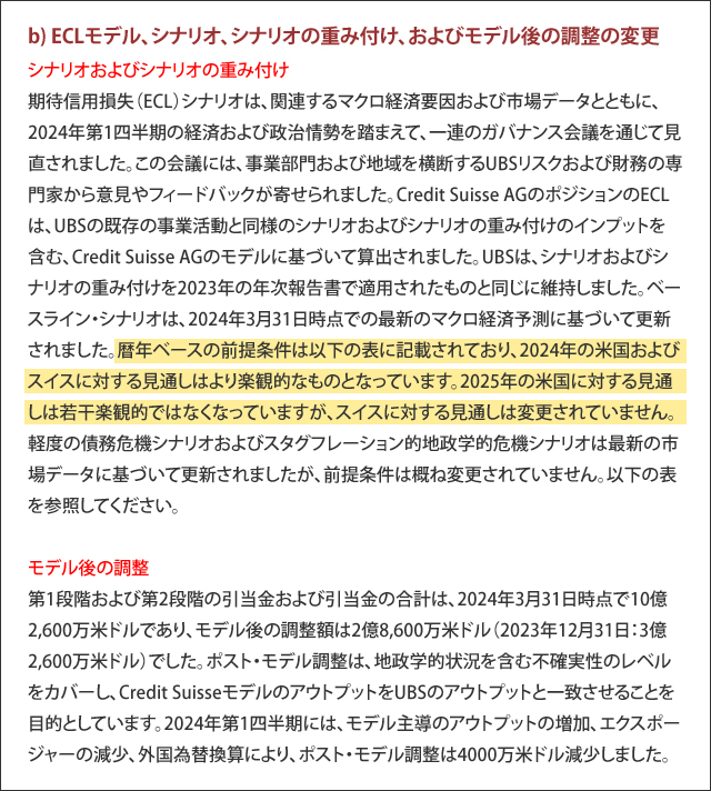 🚩– 予想信用損失(ECL)はどうでしょうか? ご覧のとおり、UBSは米国とスイスの経済の将来について非常に楽観的で、ベースライン予想を改善しただけでなく(picture 1)、2024年第1四半期の予測から「世界的危機」シナリオを完全に削除しました(picture 2)。この結果、ECL用に確保された金額はわずか1億600万ドルにとどまりましたが、これは冗談ではありません。