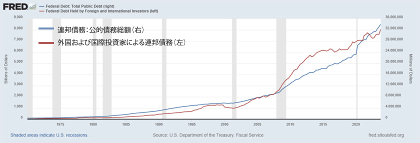 さらに、下のグラフからわかるように、外国人が保有する米国連邦債務の総額は、米国連邦債務全体の増加とともに、長年にわたって増加し続けています。