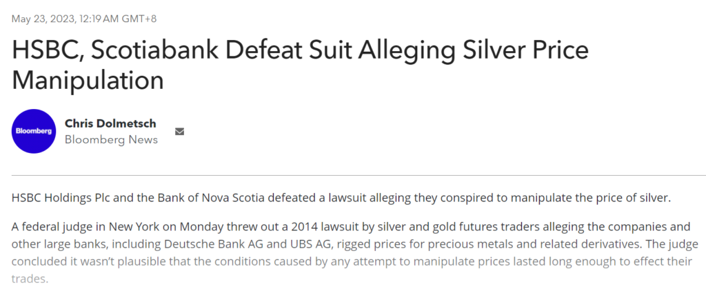米国とカナダで提起された2件の集団訴訟では、UBS、Deutsche Bank(ドイツ銀行/DB)、HSBC、Bank of Nova Scotia(スコシアバンク/BNS)が1999年から2014年の間に銀価格を操作し、特に自己勘定取引の空売りポジションで利益を得るために価格を抑制したとして共謀したと訴えられました。HSCBとBNSは米国の訴訟で勝訴し、判事は価格操作行為が実証されているにもかかわらず、「他の経済的要因」が銀価格の変動に寄与したとの判決を下しました。