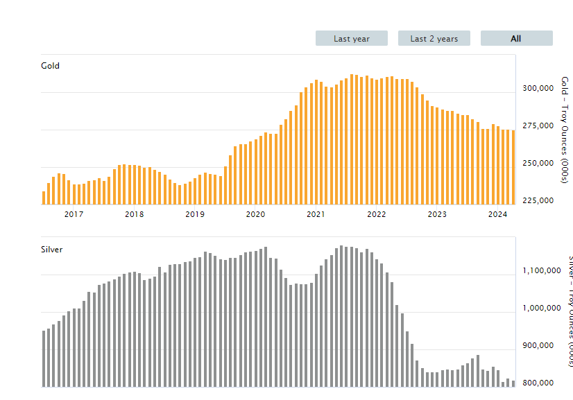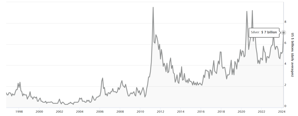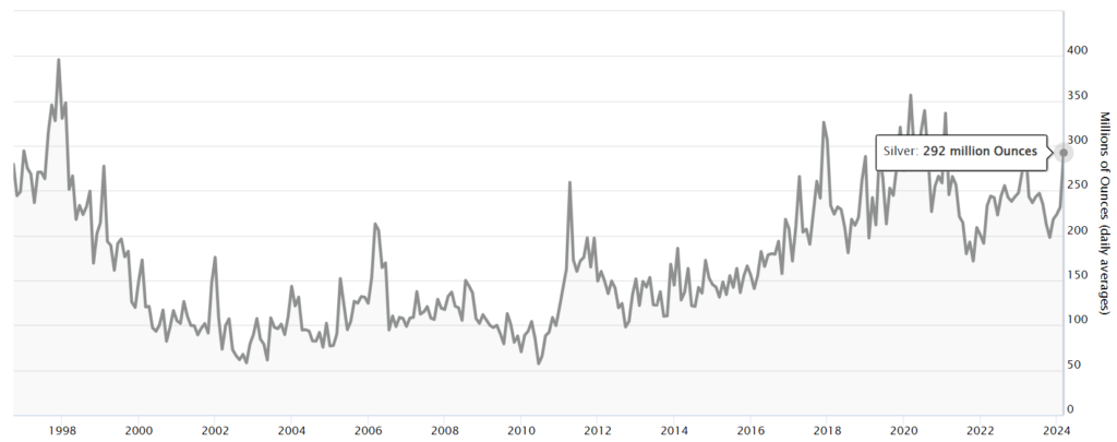以下の2つのグラフは、LBMAデータによると何か特異なことが起こっていることを示しています。金庫に移送され、清算機関によって管理されている銀の最新の1日平均量は、1日平均価値70億ドルに対して2億9,200万オンスと報告されており、これは銀の最新の1日平均清算価格が約24ドルであることを示しています。