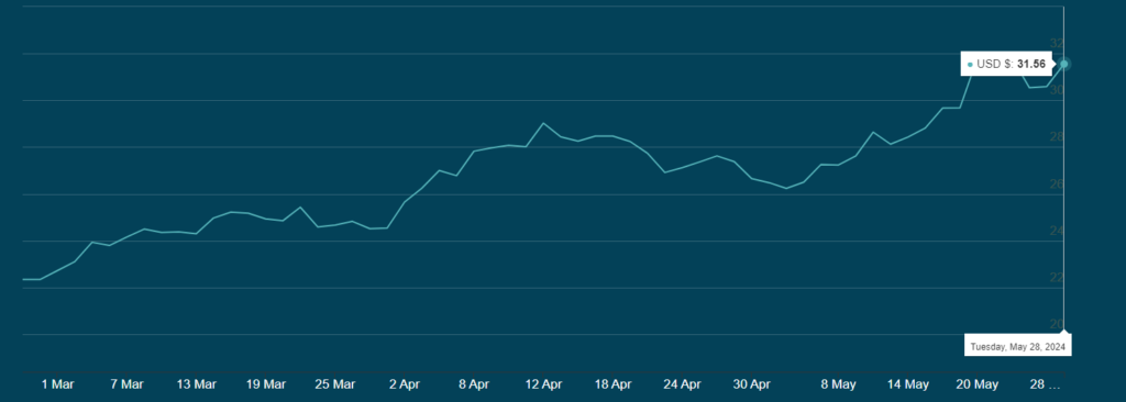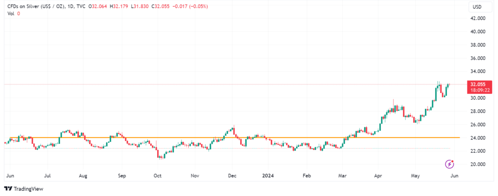 ここでちょっとした問題があります。LBMA独自の銀固定価格によると、最新の値は31.56ドルで、銀が最後に24ドルで取引されたのは… 独自の固定価格によると3か月前です。