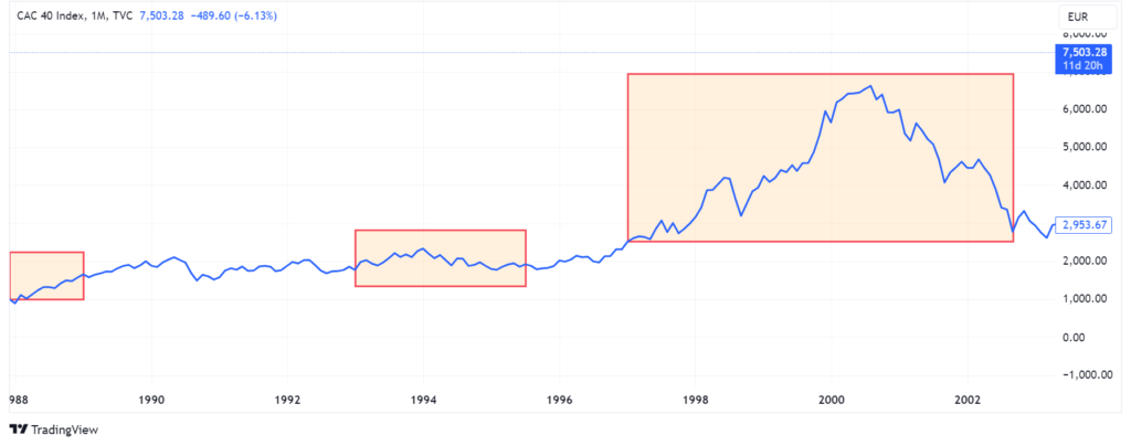 当時のフランスの株式市場はどのような動きを見せたのでしょうか? 下のグラフからわかるように、この「共存」は結局、いかなる種類の株式市場の暴落も引き起こしませんでした。