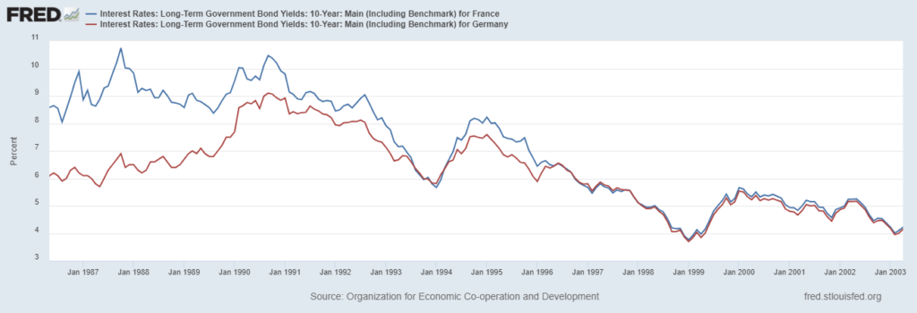 国債利回りはどうでしょうか? フランスとドイツの両国債の10年利回りを含む以下の2番目のグラフからわかるように、「共存」は、もしあったとしても、両国債のスプレッドにほんの短い影響しか与えませんでした。