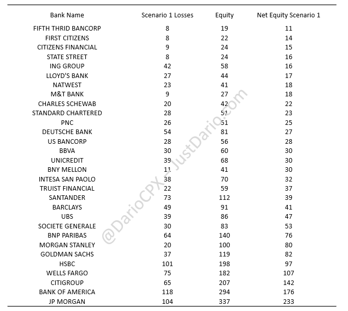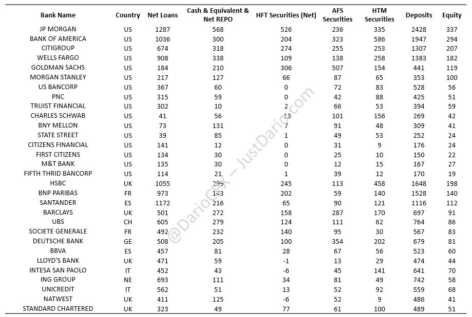 この記事に使用したデータセット全体は、以下のとおりです。数字は10億米ドルで、米ドルで直接報告していない銀行の数字を変換するために、EUR/USDを1.07、GBP/USDを1.26にしました。米国以外の銀行については、米国の報告基準に従って、「現金および同等物」、「ネットレポ」残高、「HFT」、「AFS」、および「HTM」に再分類しました。私が提示した計算結果が気に入らない場合は、自由に計算して独自の結論を出していただいてかまいません。