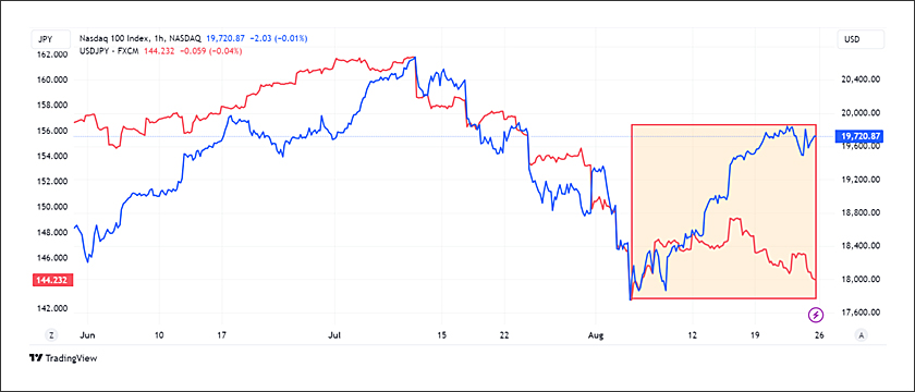 さらに、日本円(JPY)とナスダックを比較するとわかるように、最近のスクイーズにより両者の間に信じられないほどの乖離が生じています。