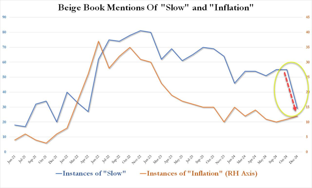 9月、通常は退屈でほとんどの人が読まないベージュ・ブック報告書(その膨大な量と悲惨な信号対雑音比のため)が、突如として注目度と人気が急上昇しました。ジェローム・パウエル氏が、FRBによる50ベーシスポイントの利下げ後に、ベージュ・ブックを綿密に追っていたことを説明し、それがFRBによる予想外の「大型」50ベーシスポイントの利下げの推進力となったことが明らかになりました。そして、他の人たちとは異なり、私たちは実際にベージュ・ブックを読んでいます。だからこそ、FOMCによる利下げの2週間前に、最新のレポートの分析を次のように題したのです。「醜いベージュ・ブックが経済活動の『停滞または後退』を明らかに、ほとんどの地区で個人消費が減速」 だからこそ、パウエル氏が慌てた理由、そして9月と11月に利下げが続いた理由、そして選挙のわずか数日後だった理由が理解できるでしょう。