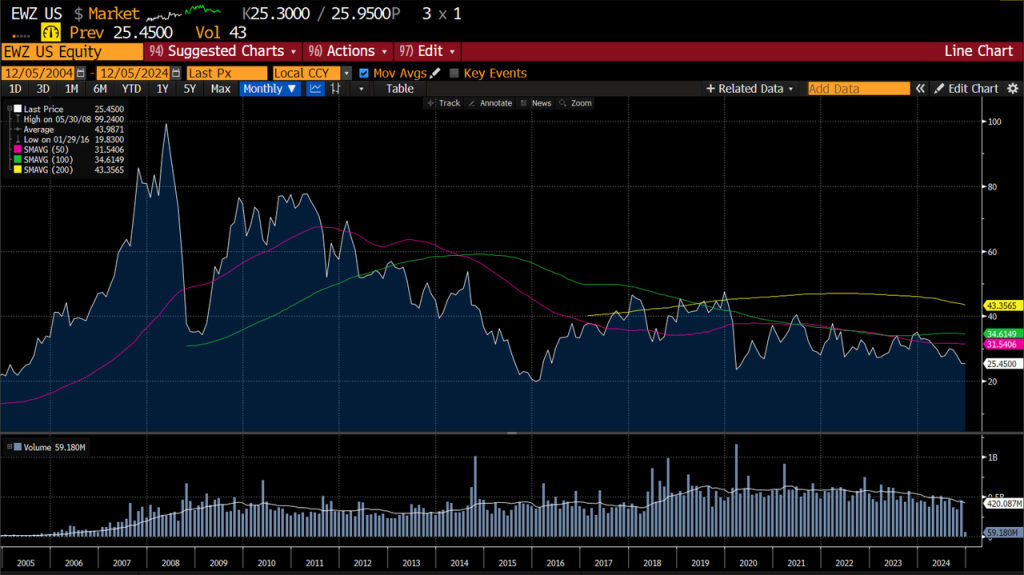しかし、ブラジルはこの支出により通貨安に苦しんできたため、ブラジル資産への米ドルのリターンは芳しくありませんでした。以下は、ブラジル株式に連動する米ドル建てETFであるEWZです。通貨安が株式パフォーマンスを上回っています。