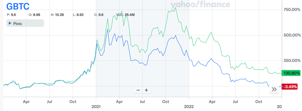 ちょっと待ってください。では、なぜ2021年にスプレッドが崩壊してマイナスになったのでしょうか? 以前にも強調したように、Three Arrows Capital(および多くの他の企業)はGrayscale Bitcoin Trustを担保として利用して、より多くの資金を借り入れました。そのことを念頭に置いて、現在のGrayscale Bitcoin Trust(GBTC)対Bitcoin(BTC)チャートを見てみましょう。
