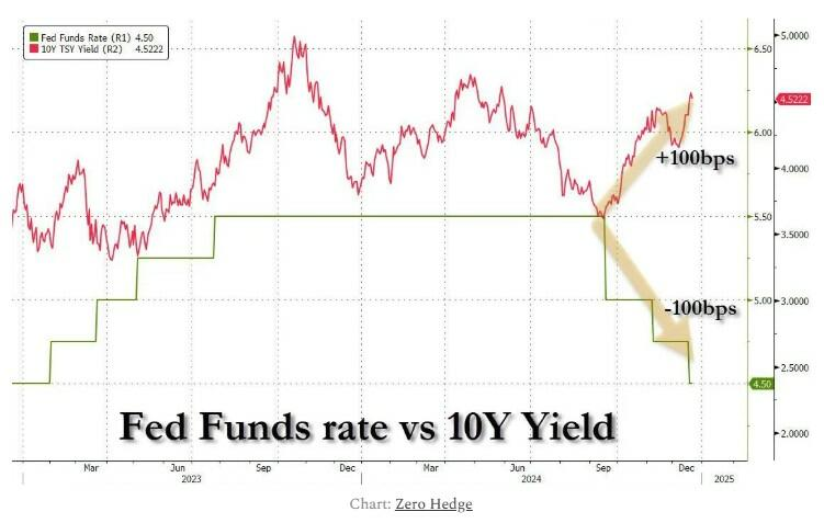 したがって、債券は市場に「異常事態」が起こっていることを示唆しています。Zero Hedgeは、この現象について「100ベーシス・ポイントの利下げが10年物利回りを100ベーシス・ポイント上昇させたのは史上初」であると指摘しています(通常、この2つは方向性が一致して動きます。チャートを参照)。