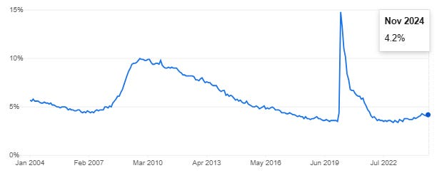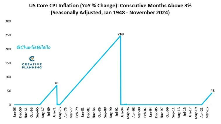 しかし、今年はトランプ氏への追い風が、現実を反映したいくつかの逆風と向き合わなければならなくなるでしょう。その逆風の一つ目は、FRBがインフレ問題を解決していないことです。これは、私が先週の記事で説明し、話題にした内容です。私の好きなアナリストの一人であるチャーリー・ビレロ氏は、「米国のコアCPIは43ヶ月連続で3%を超えており、これは1990年代初頭以来、米国で最もインフレ率が高かった期間である」と指摘しています。