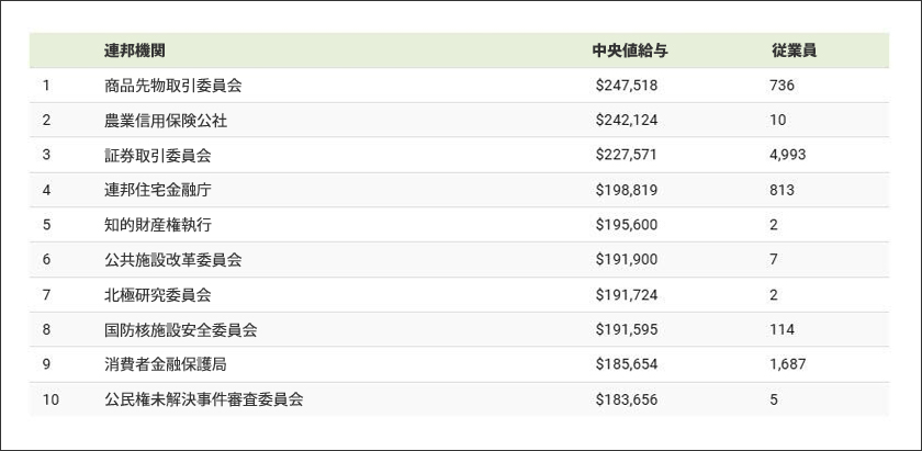 中央値給与額トップ10の連邦政府機関