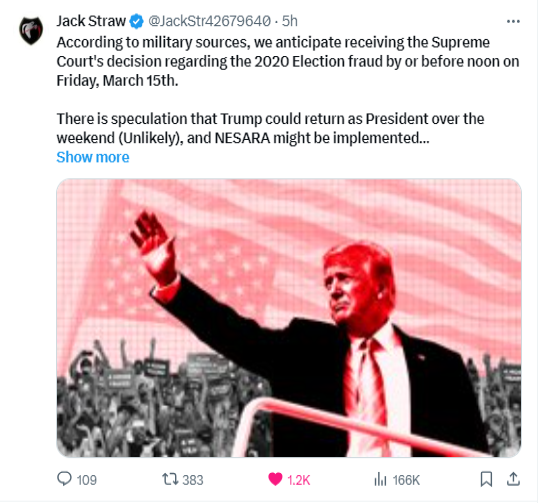 全米が政治情勢の激変に備えるなか、軍筋からささやかれているのは、争点となっている2020年の不正選挙に関する最高裁の判決が間近に迫っていることを示唆するものだ。期限は3月15日に設定され、トランプ前大統領のホワイトハウス復帰の可能性について憶測が飛び交う中、期待は重苦しい空気に包まれている。NESARAが実施され、銀行が閉まる聖週間の休暇中に、完璧な嵐が吹き荒れることを示唆している。