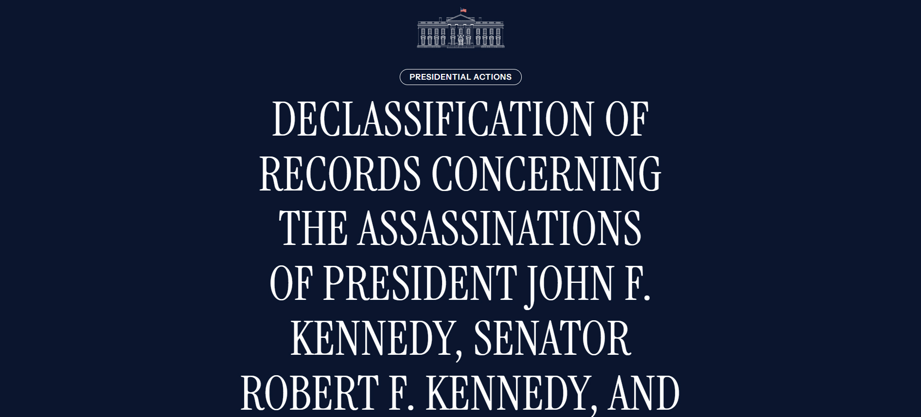 私は、ジョン・F・ケネディ大統領暗殺に関する記録から継続的に情報を削除し、公開しないことは公益に適うものではなく、これらの記録の公開は長らく遅れていると判断した。 また、ロバート・F・ケネディ上院議員とマーティン・ルーサー・キング・ジュニア牧師の暗殺に関する情報の公開を指示する連邦議会の法令はないが、連邦政府が保有する両暗殺事件に関するすべての記録の公開も公益にかなうと判断した。