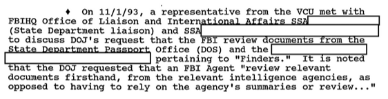 1993年11月12日付の99ページには、国務省がFBIにHQレベルでの問い合わせ対応を依頼したことが示されています。