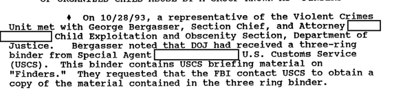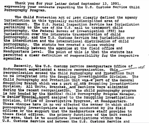 さらに悪いことに、1991年の50ページには管轄に関するメモが記載されています。このメモには、米国郵便公社、FBI、USCSが児童犯罪の縄張りをどのように分け合っているかが記載されています。USCSは「児童ポルノの差し止めと国際的な流通」を管轄しています。