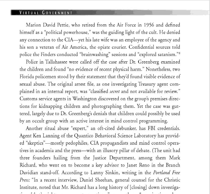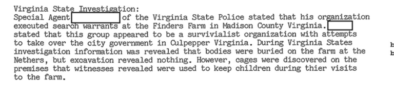 報告書には、バージニア州カルペッパーのファインダーの農場で遺体が埋められていることが言及されています。檻もありました。CIAの役割が言及されていますが、複雑です。まるで、より強力な機関が、悪魔崇拝者を特別な保護対象として扱っているかのようです。今日のような、ひっくり返って、乗っ取られた世界では、それも驚くことではありません。